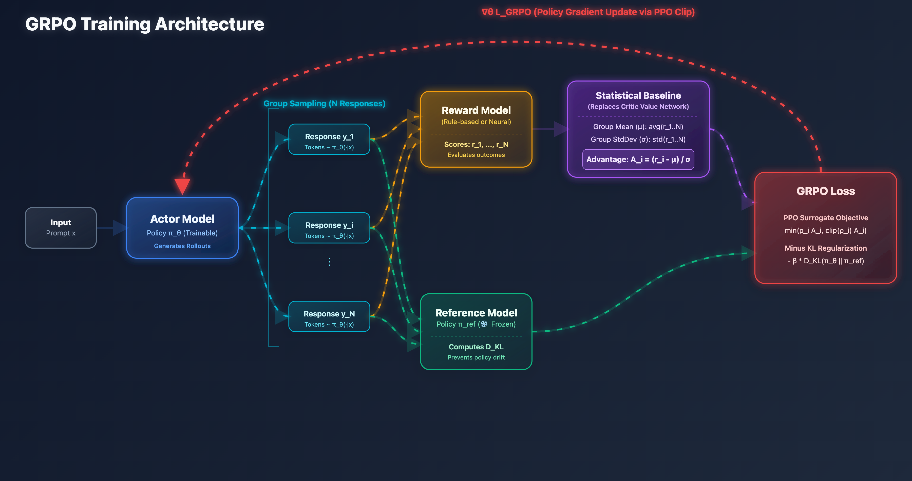 由于去掉了 Critic,优势函数的计算变为基于整个句子的相对优势,不再精确到 Token 级别。为了防止模型作弊(Reward Hacking),GRPO 将 KL 散度约束直接加入到了最终的 Loss 函数中: