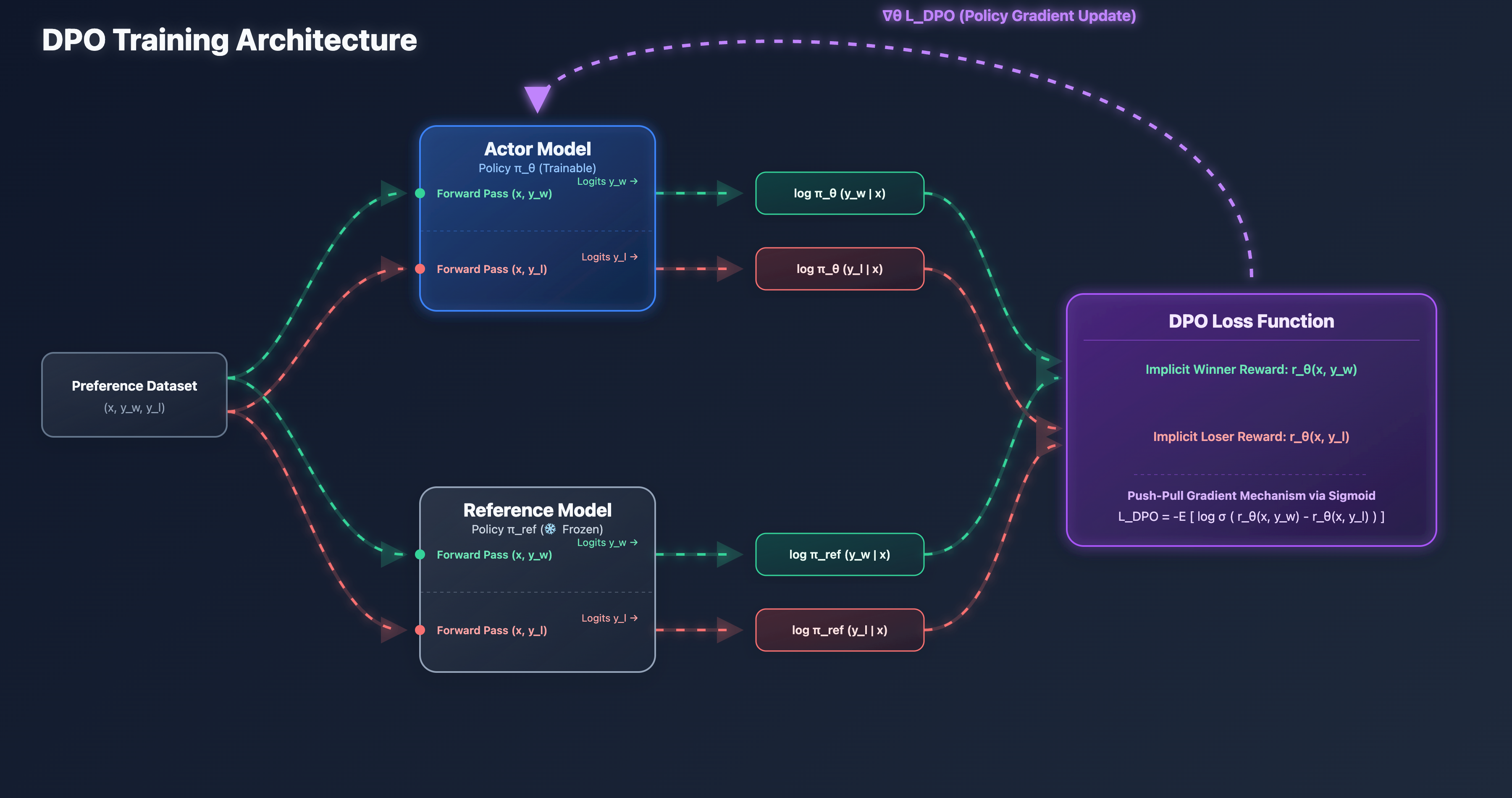 在准备数据时,我们本身就拥有标注好的偏好对:正常回答 (Win) > 糟糕回答 (Lose)。